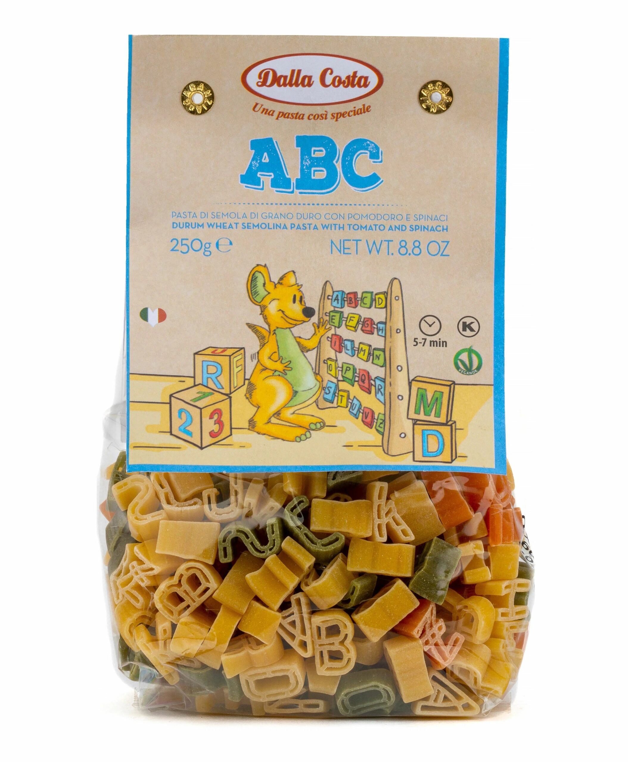Макаронные изделия без яиц Dalla Costa со шпинатом и томатами «Алфавит», 0,250 кг