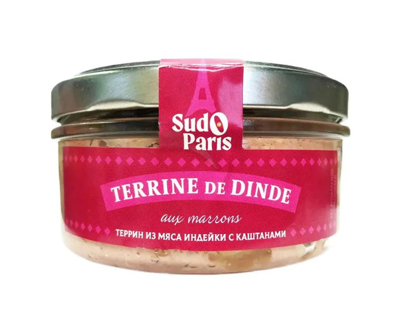 Нежнейший террин с неповторимы ореховым вкусом. Террин из мяса этой птицы содержит много белка, витамины группы В, питательные вещества. Индейка с каштанами — традиционное угощение французской кухни на праздничном новогоднем столе, но это совсем не значит, что покупать этот паштет можно только в праздники, балуйте себя тогда, когда Вам захочется. Рекомендуется подавать в холодном или теплом виде с картофелем, хлебом или сдобными булочками, овощными и картофельными салатами. Хорошо сочетается с различными соусами к дичи и домашним майонезом, сдобренным ароматными травами. Также паштет можно предложить в качестве закуски, положив вокруг нарезанный кубиками застывший бульон. Замечательная пара к бокалу красного вина.